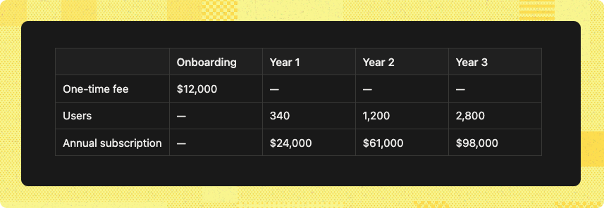 Why it works: This creates a believable setup where buyers can see how a company scales with your product. It shows the onboarding cost as a separate line item, then how the subscription grows with usage over time. If you’re running usage-based pricing, it can be really hard to understand before you’re onboarded. This makes it tangible.