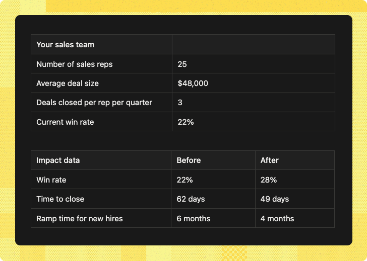 With a 6% lift in win rate, your team will close 18 more deals per year, adding $864,000 in new revenue. Faster ramp means your new hires hit quota 2 months earlier — worth another $96,000 in accelerated pipeline.