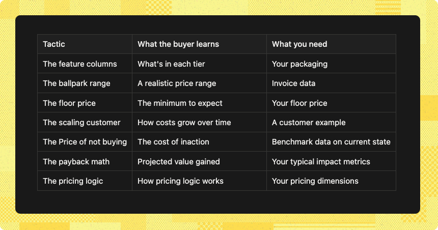 This is NOT a replacement for doing the work. These are tactics for when you for some reason really can’t show your pricing or you have to bridge now to later when it’s possible.