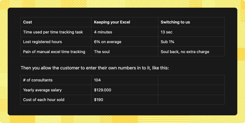 Let’s say you sell time management software in consulting. Create a comparison of all the good stuff you help optimize: Time per tracked task, lost hours to registering fails and more.