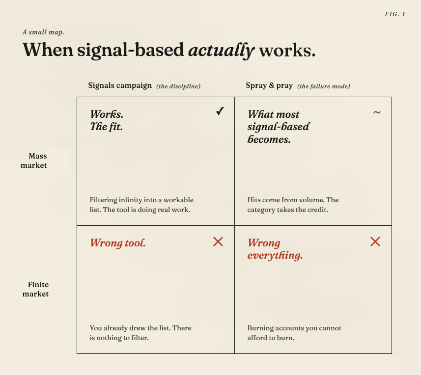 That doesn’t mean you don’t get FOMO and want signal-based like all the cool start-ups. But it’s worth knowing that running signal-based from the wrong GTM position will only fill the pipeline with the wrong leads, burn the right accounts, inflate CAC and slow growth. It will look like you have a sales execution problem. But it’s actually a strategy problem of not understanding your position and picking the wrong tools.