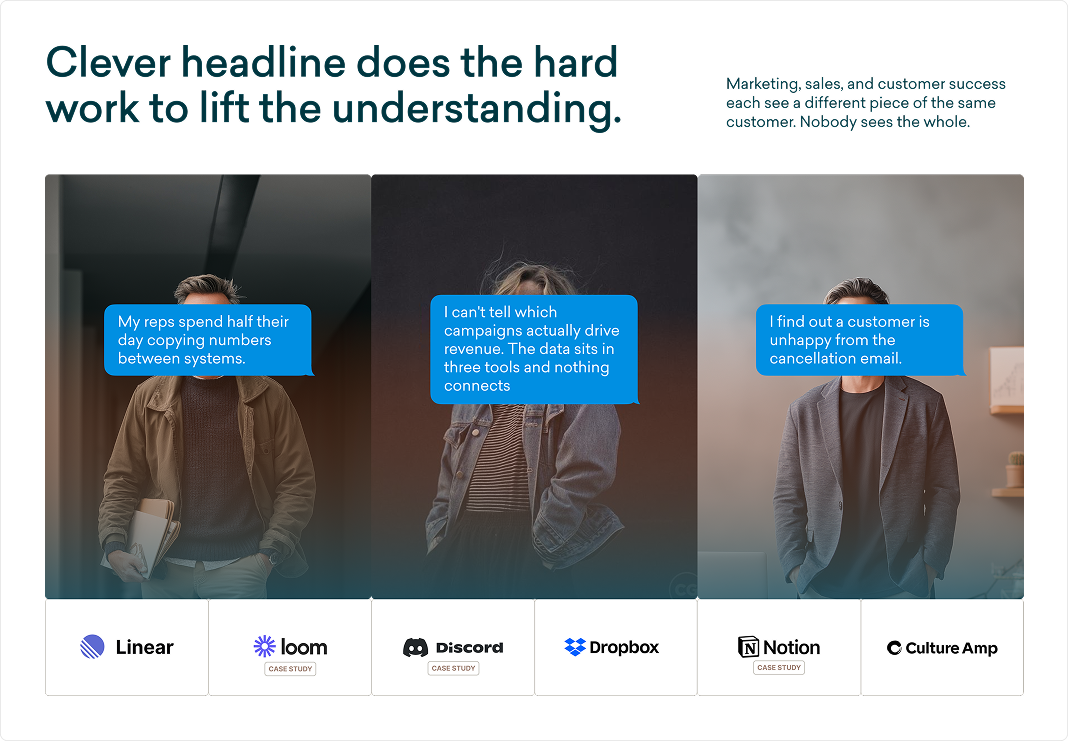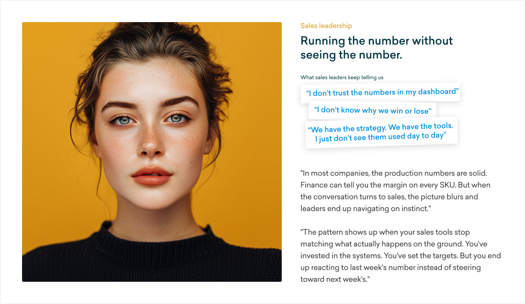 On another page, I stacked three symptoms from the same persona so a sales leader reads them and thinks "that's me, that's me, and that's definitely me":